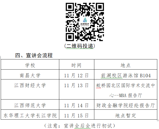 4.在招聘过程中,江西银行不会向应聘者收取任何费用,请提高警惕,谨防受骗。